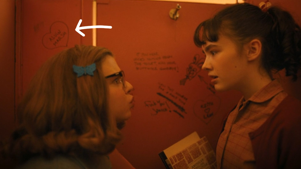 Se você olhar com atenção pra porta da cabine, verá o nome “Alvin Marsh” escrito dentro de um coração.